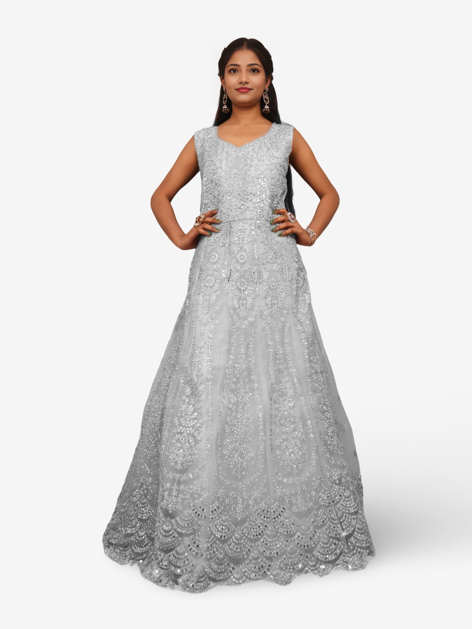 Shreekama presents a stunning Gown with Thread Work & Stones, ideal for parties and weddings. Crafted from high-quality net fabric, this ethnic gown features intricate thread work and delicate stone embellishments, inspired by Bollywood style. Flaunt your elegance and charm with its floor-length silhouette and festive allure.